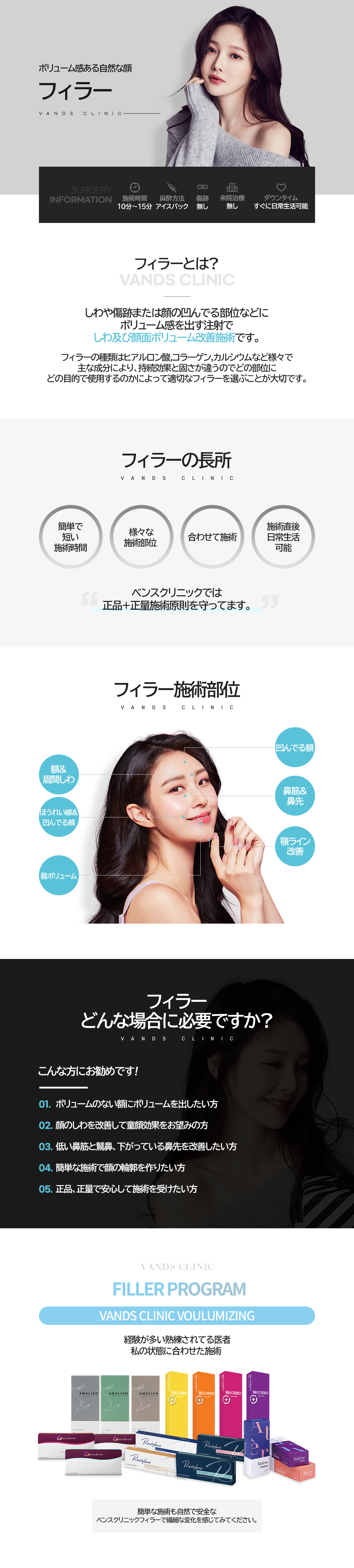 顔のボリュームとシワ改善が必要な部位に、体内吸収が容易なヒアルロン酸成分のフィラーを注入して、ボリューム形成とシワを改善する施術です。 主に額や鼻・頬・ほうれい線・目の下・あごの先等に施術を行い、り若々しい印象が期待できます。