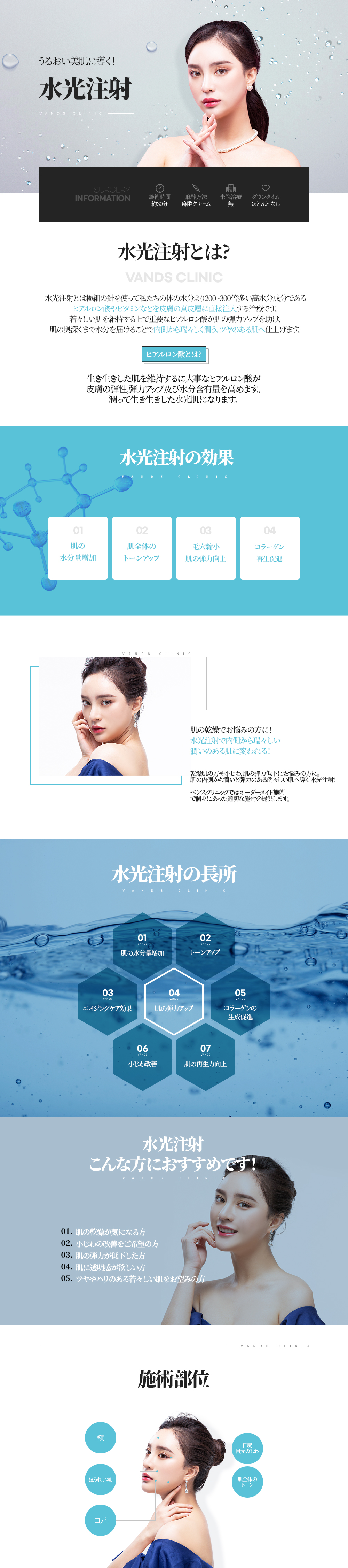 乾燥してパサついたお肌に ヒアルロン酸を注射で真皮層に直接注入することで 水分不足の肌にうるおいを与え、みずみずしくハリのあるお肌が期待できます。